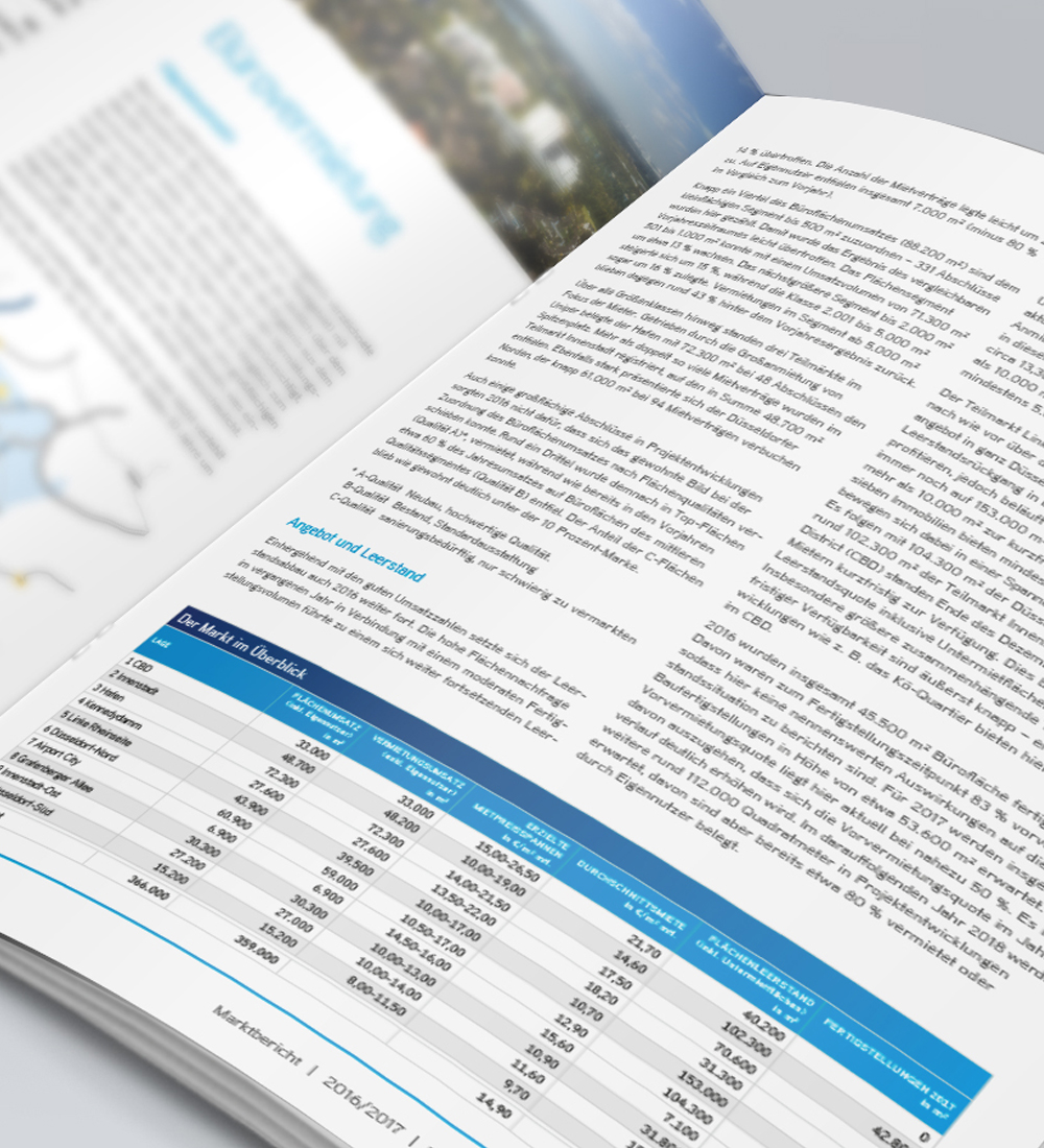 Meine Aufgabe besteht darin anhand des festgelegten CIs die Inhalte, Tabellen und Diagramme nach redaktioneller Aufarbeitung zu layouten bis hin zur fertigen Druckdatei. Der Marktbericht wird in deutscher und englischer Sprache ausgeliefert.