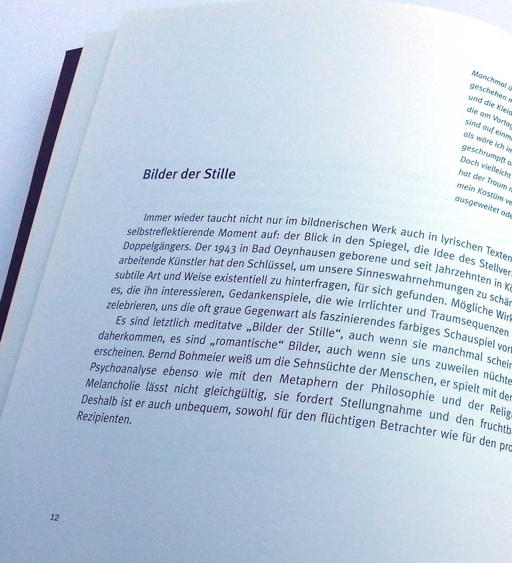 Anders bei Bernd Bohmeier: Der Mensch, das In-der-Welt-Sein des Menschen, steht im Mittelpunkt des künstlerischen Suchens und Schaffens - Bohmeier bearbeitet dieses große Thema als Maler, Lyriker und Romancier und verwickelt uns in seinen Bildern in ein faszinierendes Spiel von formaler Gestaltung und metaphorischem Gehalt.
