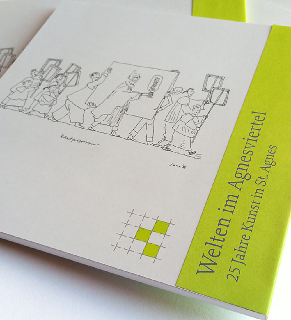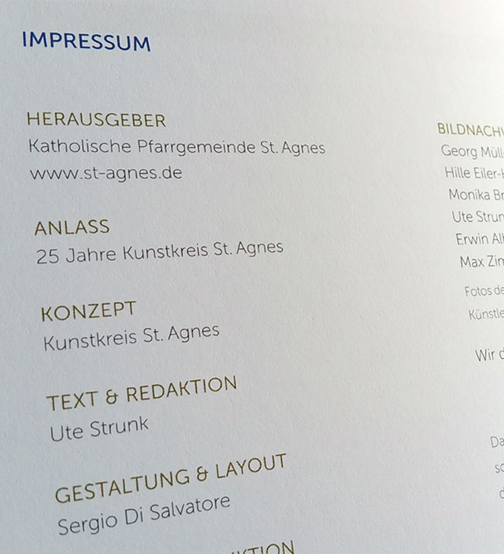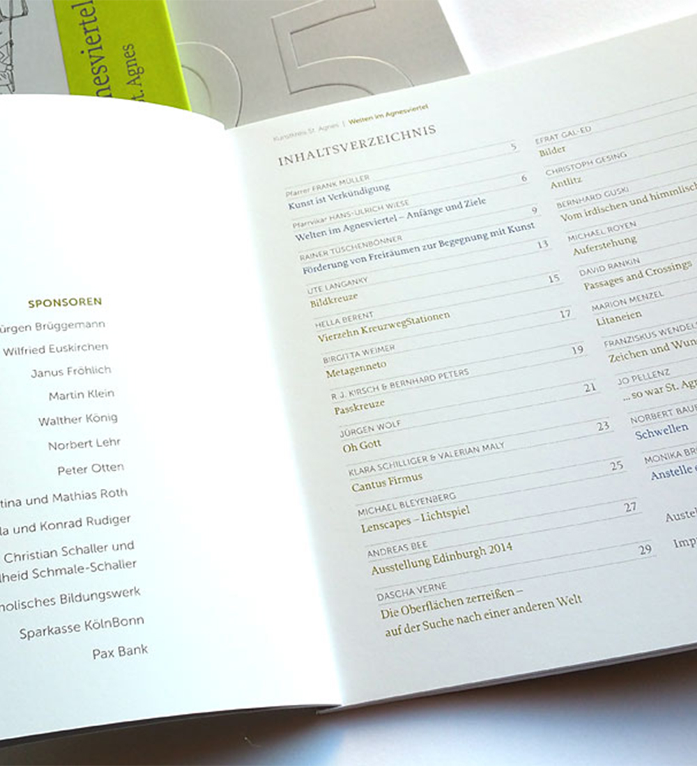 Konzept und Design. Katalog zum 25jährigen Jubiläum in St. Agnes. Im Katalog werden alle Künstler vorgestellt, die in diesem Zeitraum in St. Agnes ihre Ausstellungen präsentiert haben. Der Umschlag besteht aus einer Prägung und einem zusätzlichem, aufgeklebten Streifen, auf dem alle Künstler aufgelistet sind.