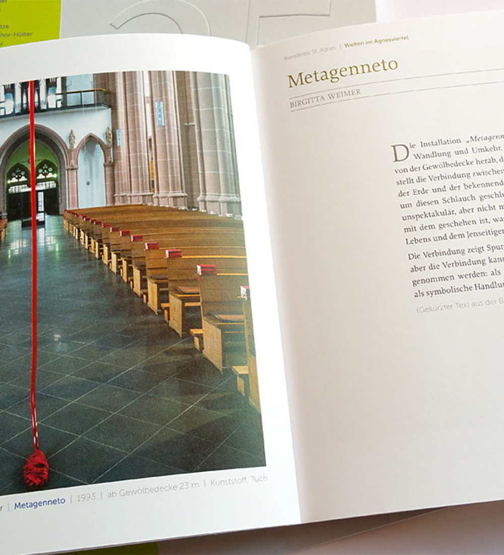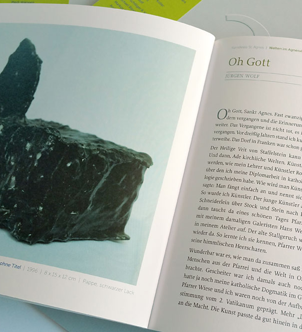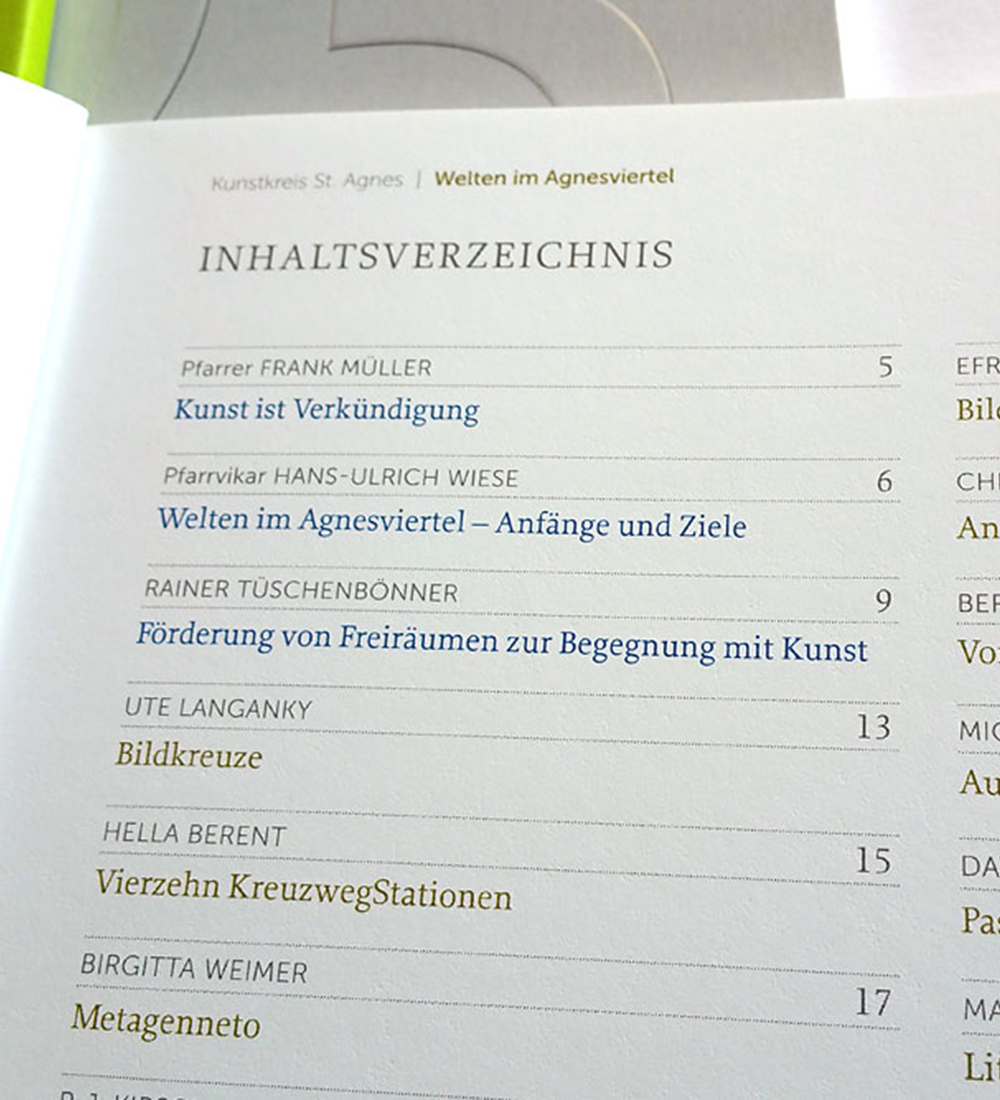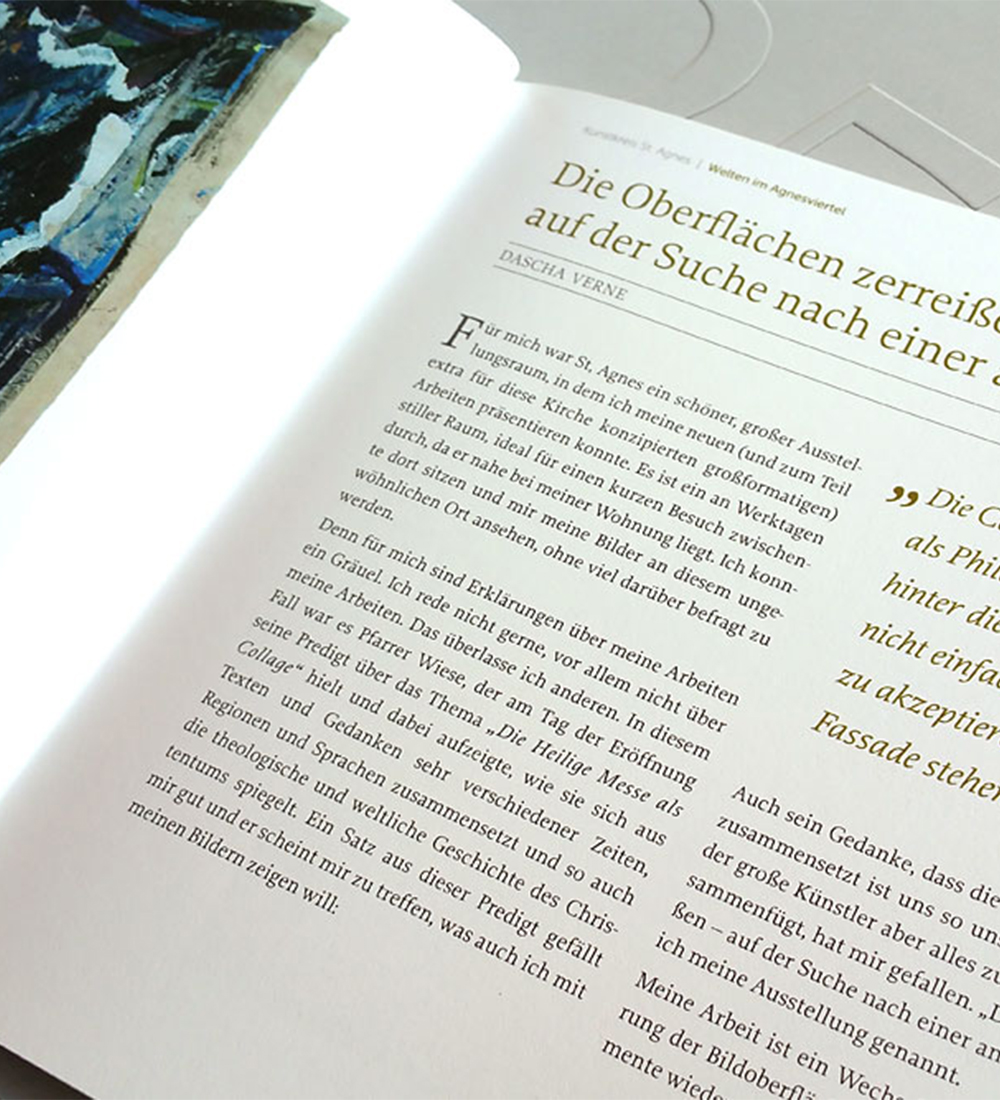 Konzept und Design. Katalog zum 25jährigen Jubiläum in St. Agnes. Im Katalog werden alle Künstler vorgestellt, die in diesem Zeitraum in St. Agnes ihre Ausstellungen präsentiert haben. Der Umschlag besteht aus einer Prägung und einem zusätzlichem, aufgeklebten Streifen, auf dem alle Künstler aufgelistet sind.
