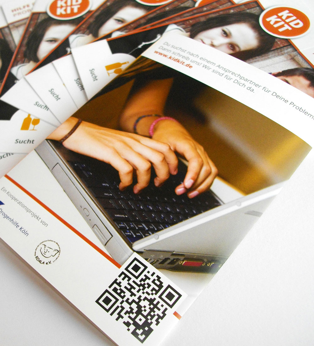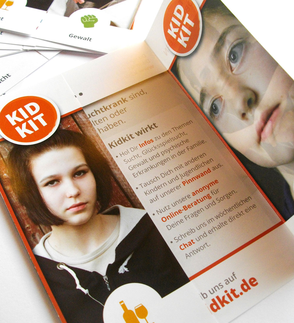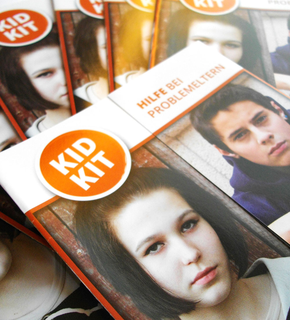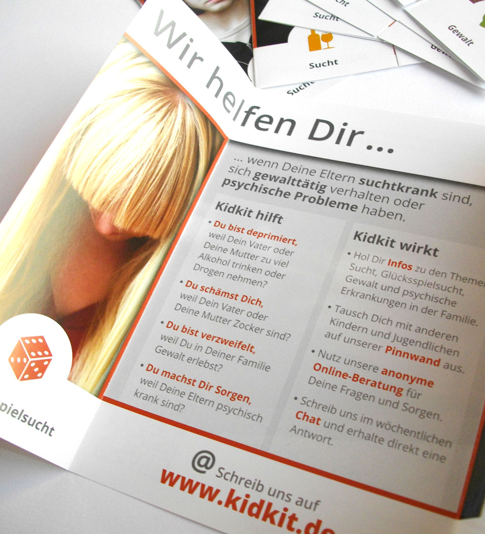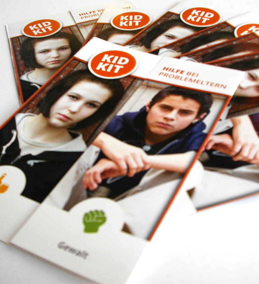 Promotion-Flyer für kidkit - Hilfe bei Problemeltern. Der Flyer wurde zur Einführung der neuen Website in einer Auflage von 50.000 Exemplaren gedruckt.