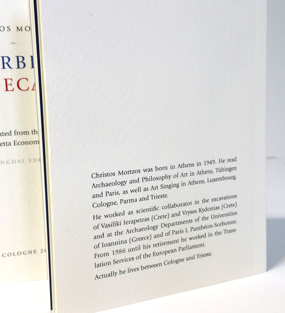 Das Buch einschließlich des Umschlags habe ich nach Freigabe von Herrn Mortzos auf einer Digitaldruckmaschine von Ricoh ProC7100X persönlich gedruckt.