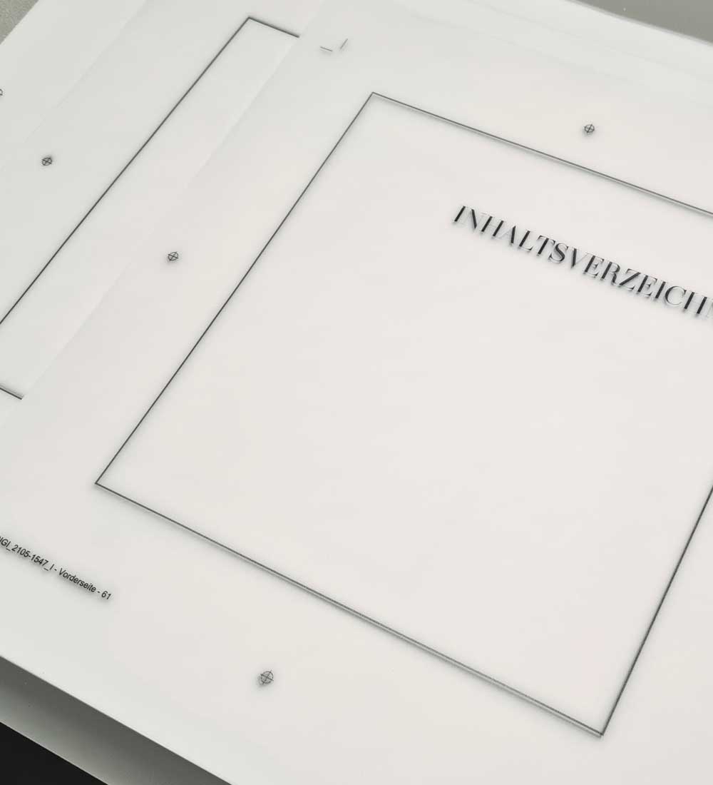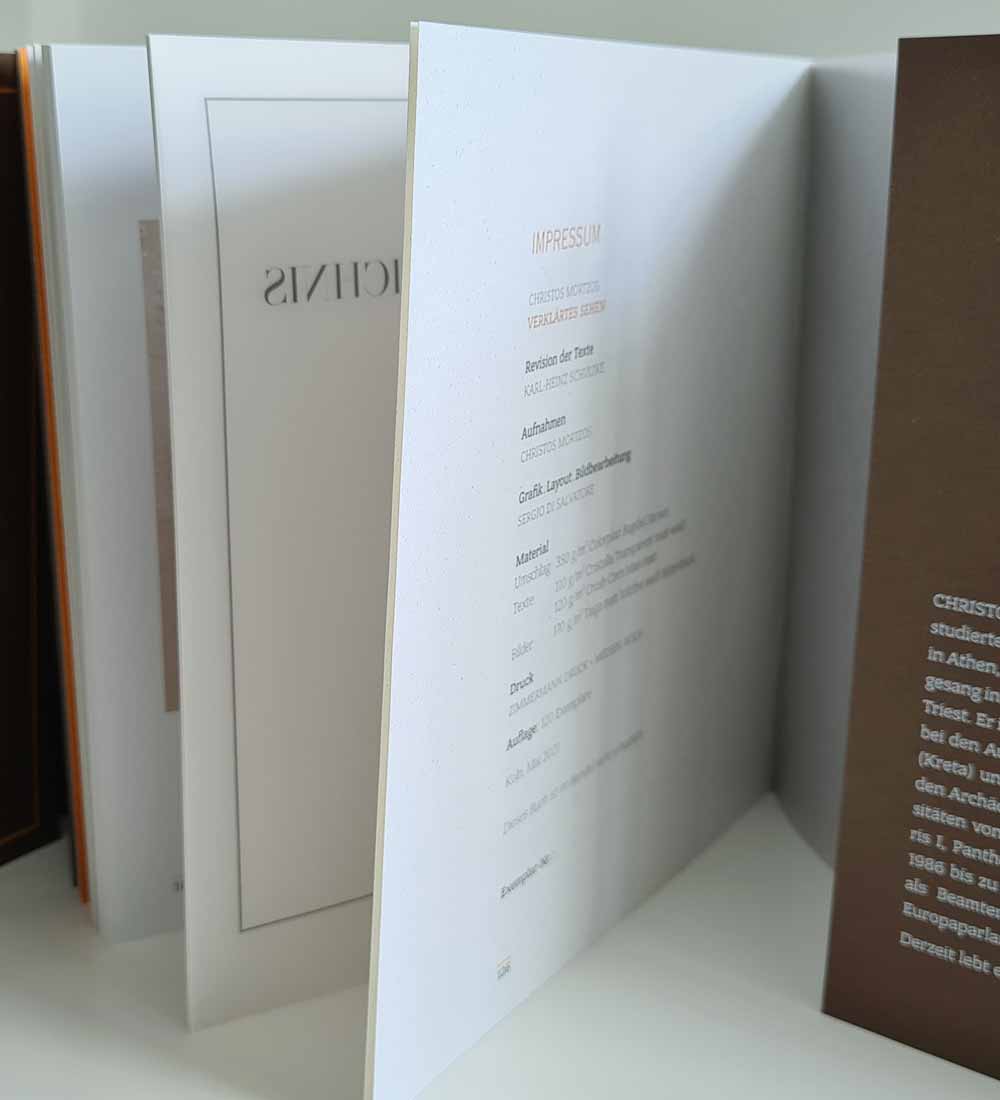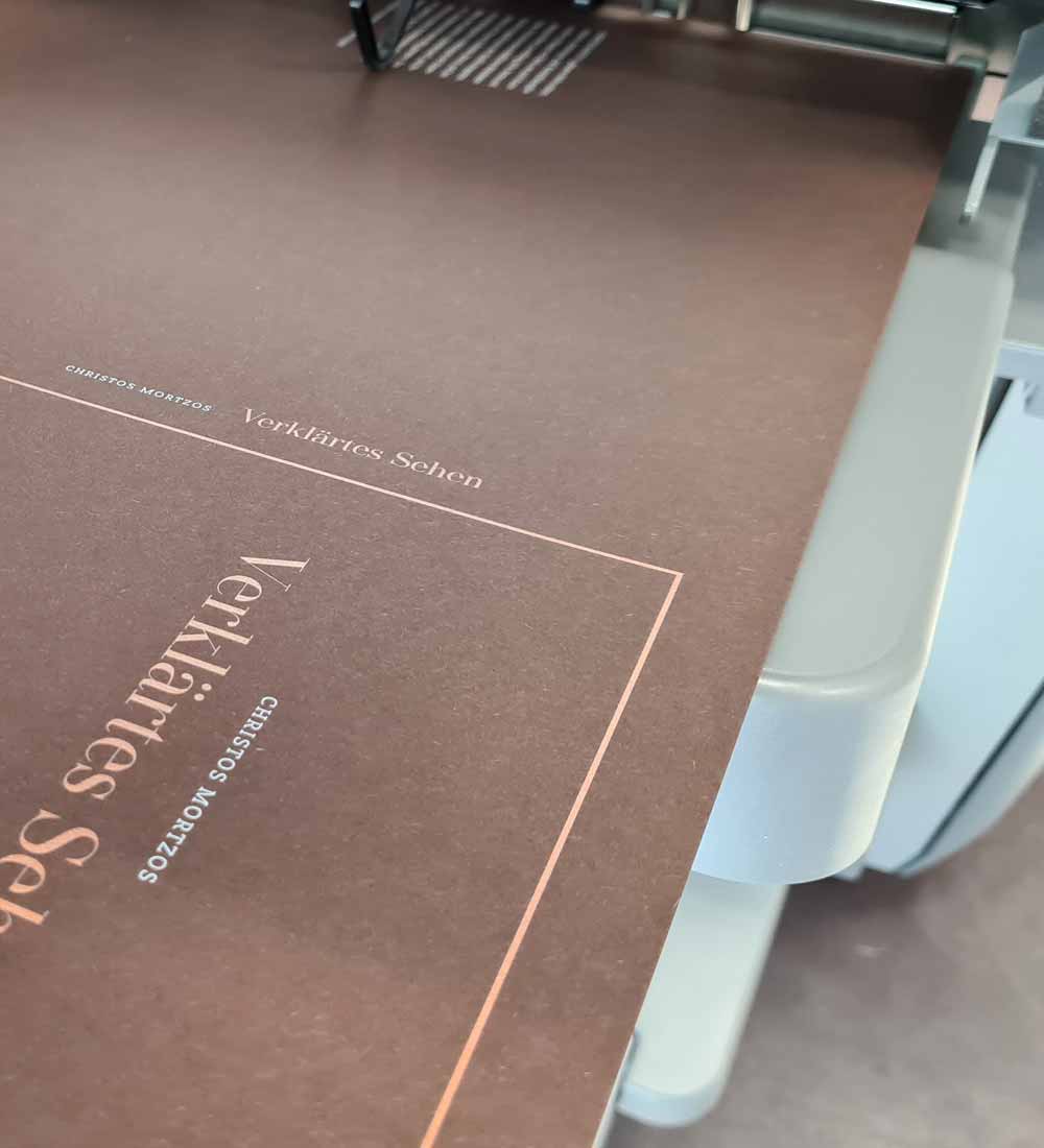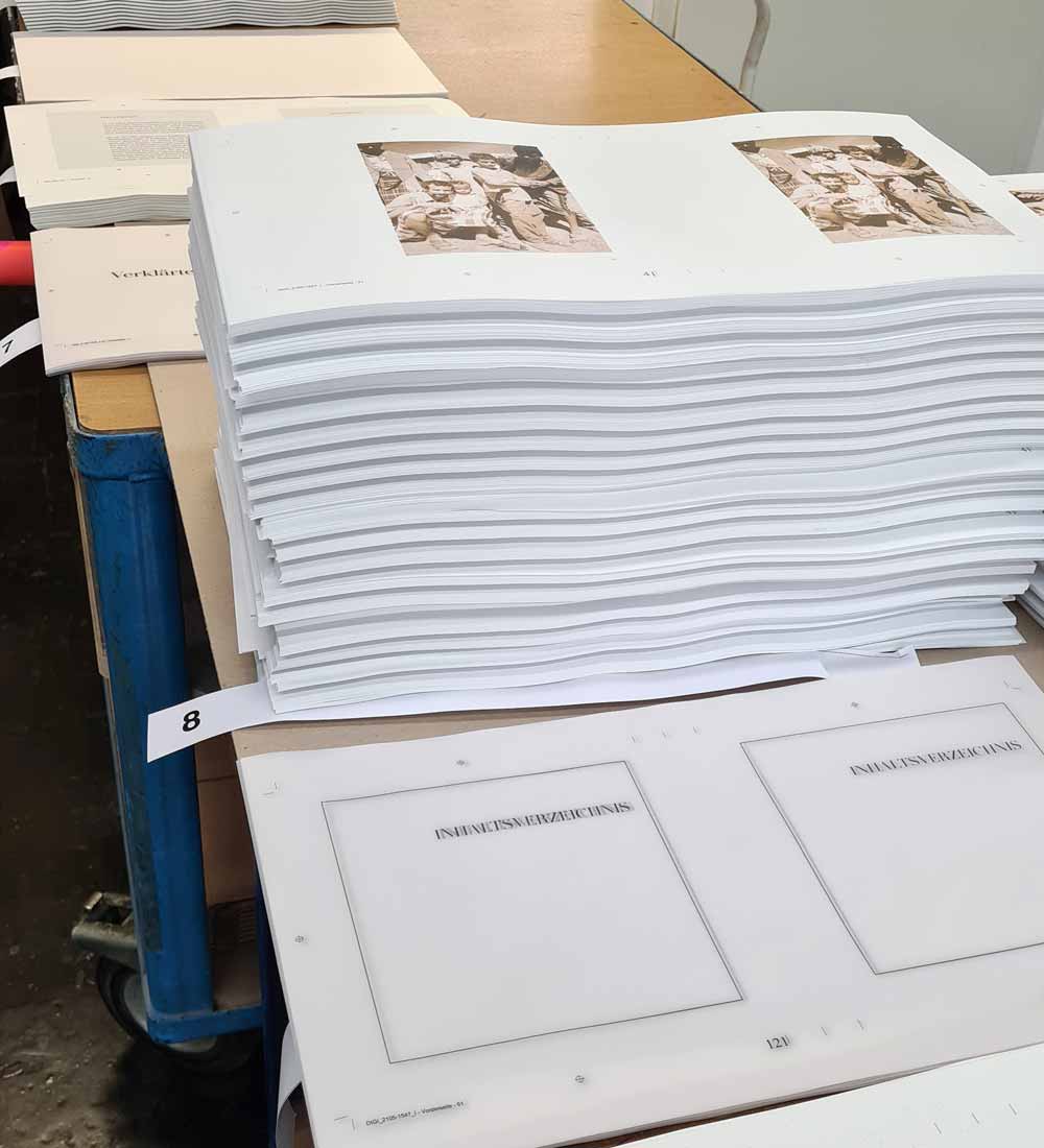Den Katalog habe ich final persönlich im Digitaldruck gedruckt. In der Bildergalerie ist zu sehen, wie aufwändig die Produktion war, bedingt dadurch, dass der Inhalt aus drei verschiedenen Papiersorten bestand, die an unterschiedlichen Stellen nach dem Druck händisch wieder zusammengetragen werden mussten – bevor der Buchbinder die Exemplare weiterverarbeiten bzw. daraus eine Klebebindung erstellt werden konnte.