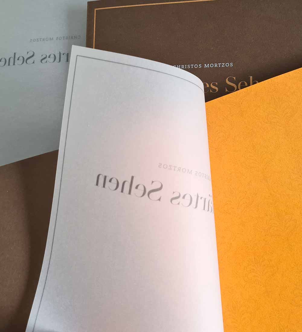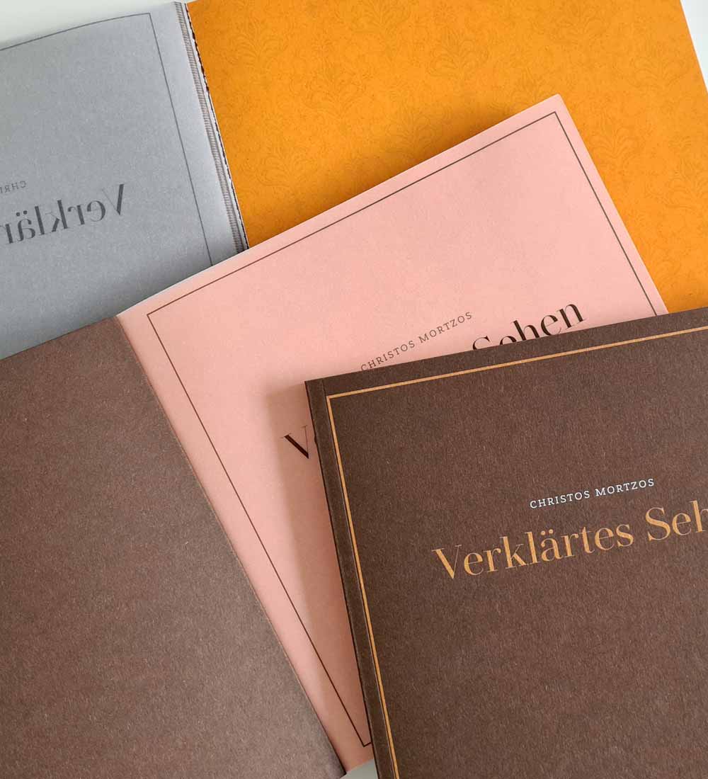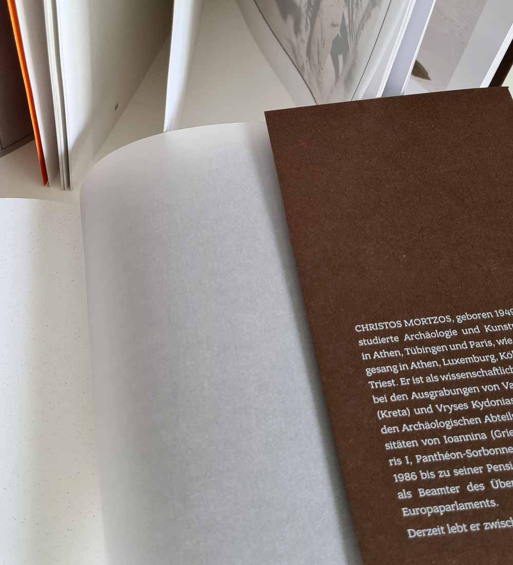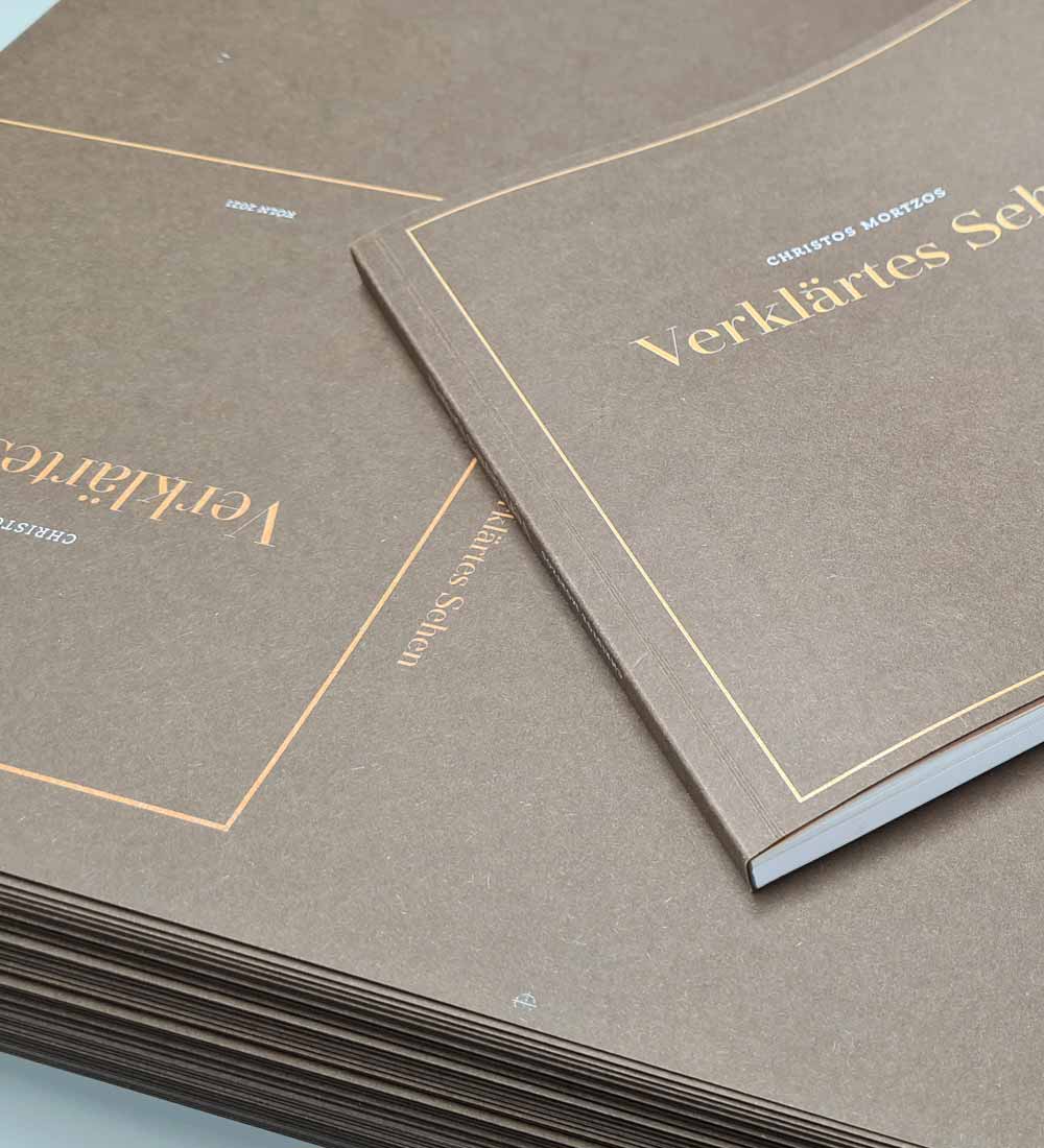 Den Katalog habe ich final persönlich im Digitaldruck gedruckt. In der Bildergalerie ist zu sehen, wie aufwändig die Produktion war, bedingt dadurch, dass der Inhalt aus drei verschiedenen Papiersorten bestand, die an unterschiedlichen Stellen nach dem Druck händisch wieder zusammengetragen werden mussten – bevor der Buchbinder die Exemplare weiterverarbeiten bzw. daraus eine Klebebindung erstellt werden konnte.