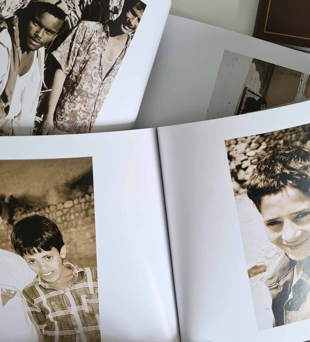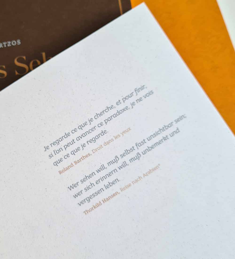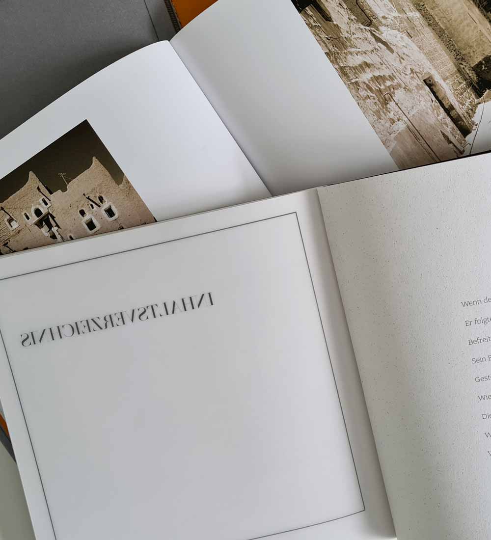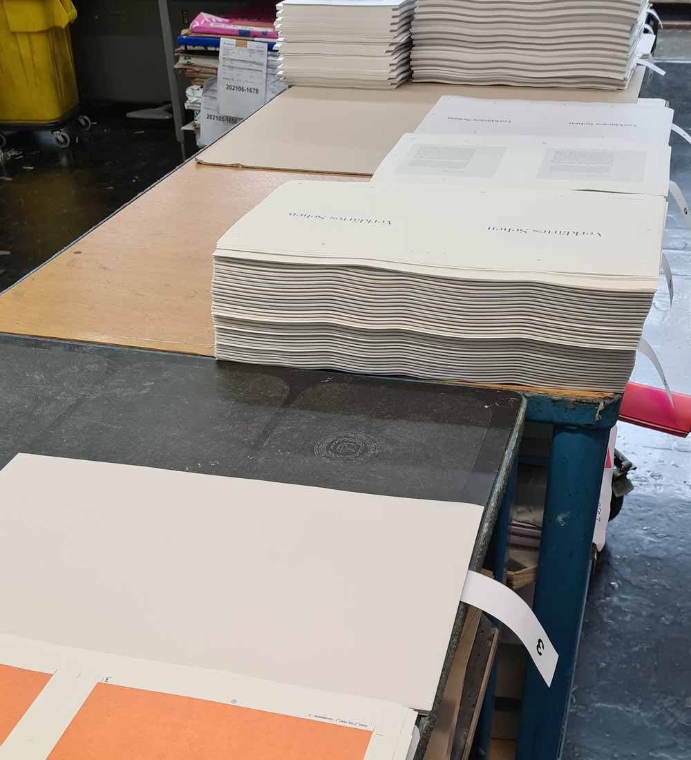Den Katalog habe ich final persönlich im Digitaldruck gedruckt. In der Bildergalerie ist zu sehen, wie aufwändig die Produktion war, bedingt dadurch, dass der Inhalt aus drei verschiedenen Papiersorten bestand, die an unterschiedlichen Stellen nach dem Druck händisch wieder zusammengetragen werden mussten – bevor der Buchbinder die Exemplare weiterverarbeiten bzw. daraus eine Klebebindung erstellt werden konnte.