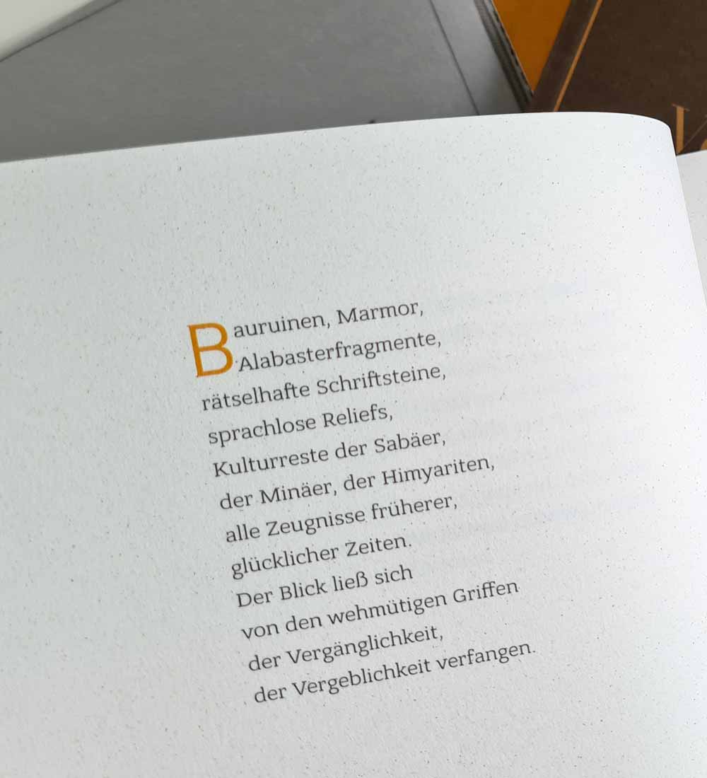 Aufnahmen und Texte dieses Buches sind aus der Begegnung mit dem Jemen entstanden, aus einer visuellen, empfindsamen Fühlungnahme mit seinen außergewöhnlichen Landschaften, seinem vielfältigen Kulturerbe und nicht zuletzt mit seinen warmherzigen, gastfreundlichen Menschen. Die Reisen in das Land fanden statt in den Jahren 1994 und 1995.