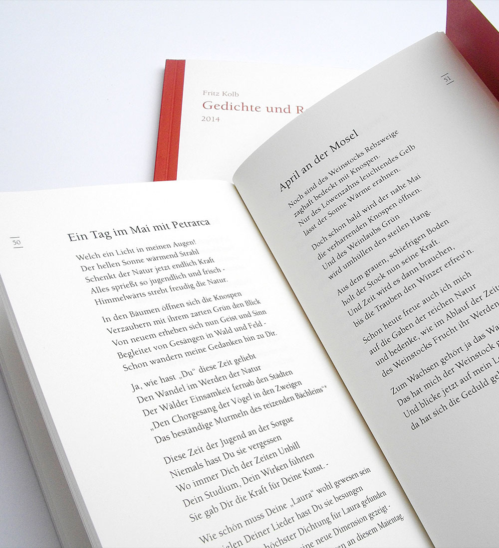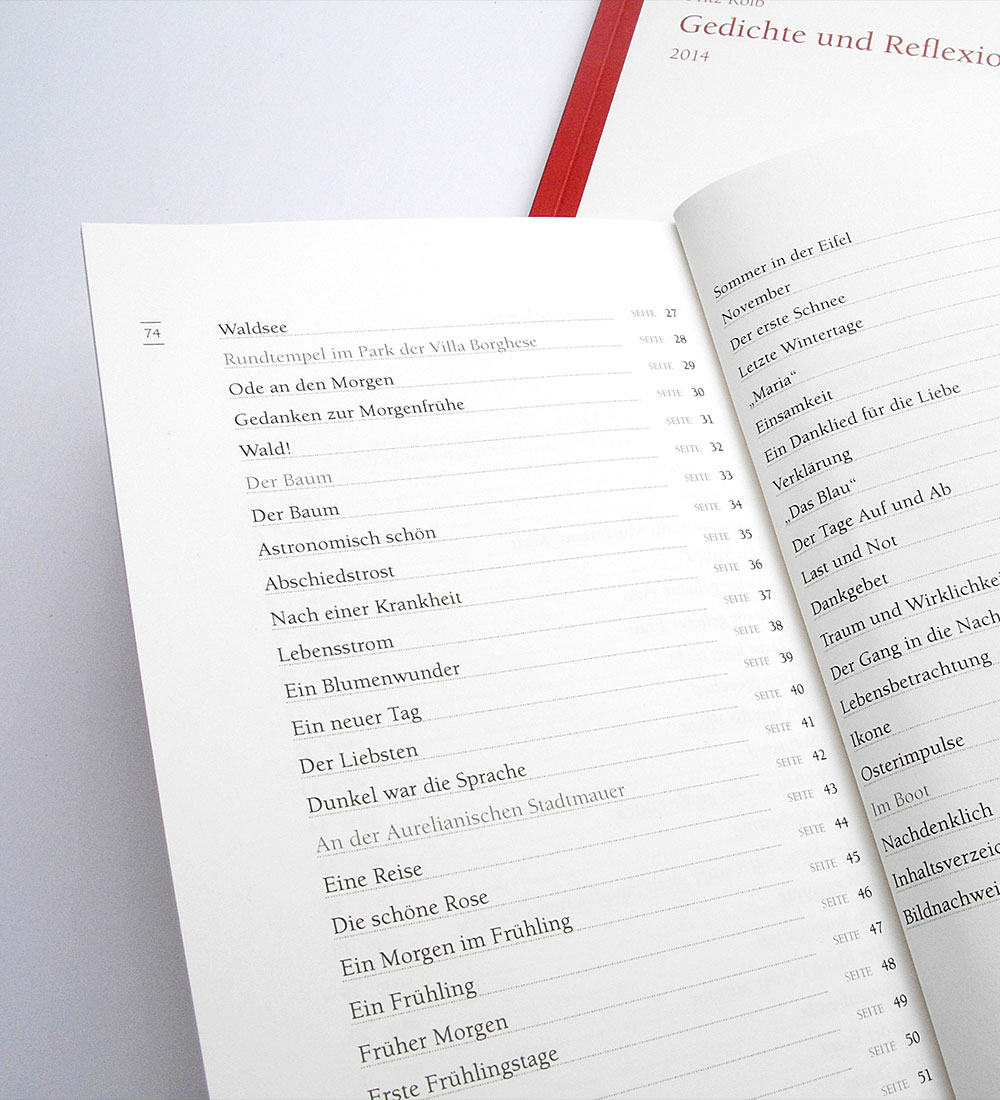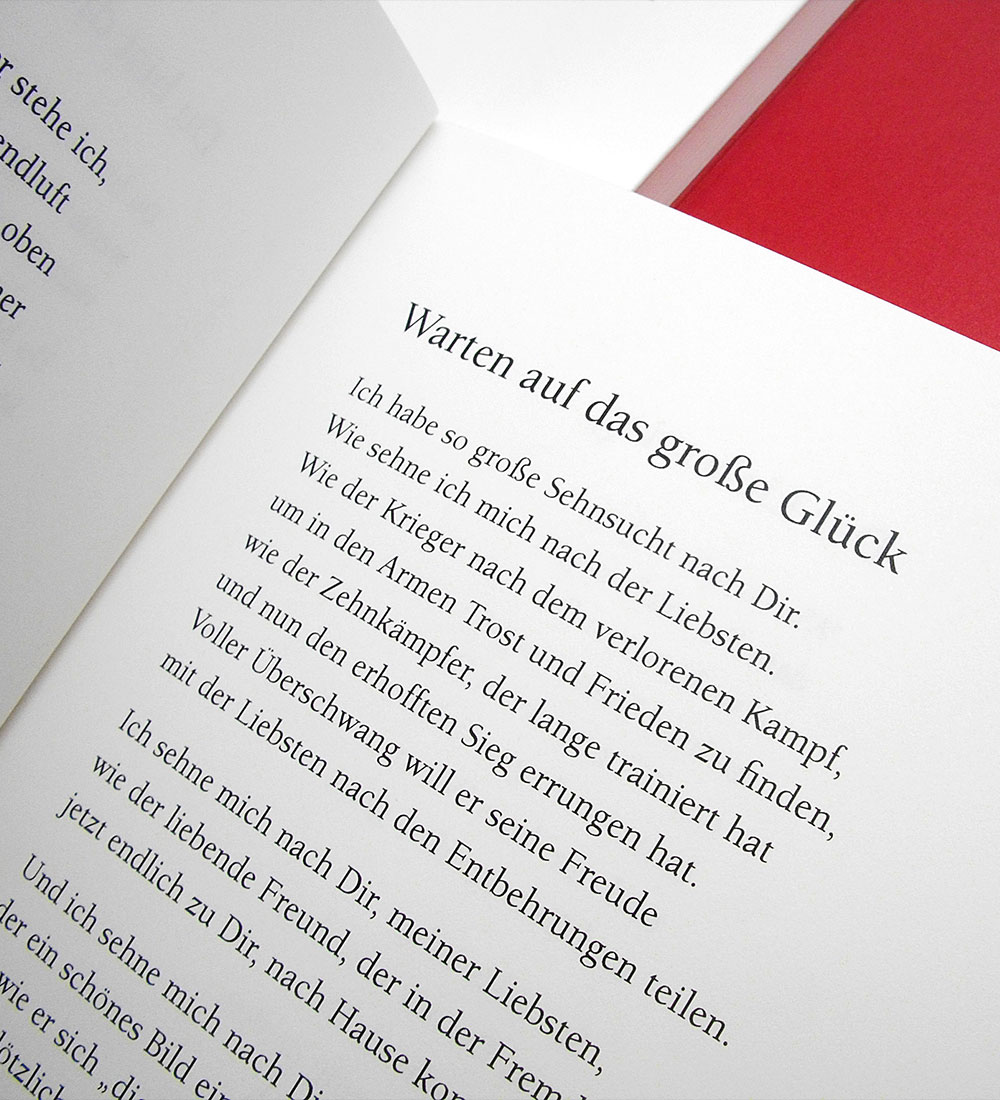 Oft sind die einfachsten Arbeiten die schwierigsten. Gute Typografie bedeutet für mich ein Zusammenspiel von Anordnung, richtiger Schriftwahl und guter Lesbarkeit. Eine Disziplin - die in unserer Gegenwart, wo jeder "schreit", "lauter" und "bunter" sein muss als sein gegenüber - viel zu selten ausgeübt wird. Umso mehr freut es mich immer wieder, wenn ich Projekte dieser Art machen darf. Genuss, entspannung und wohltuend für meine Sinne.