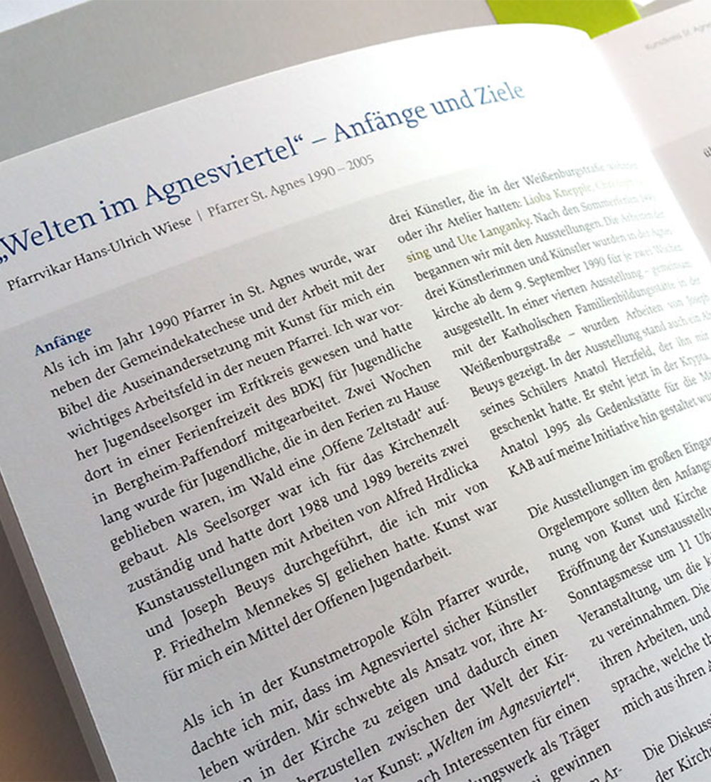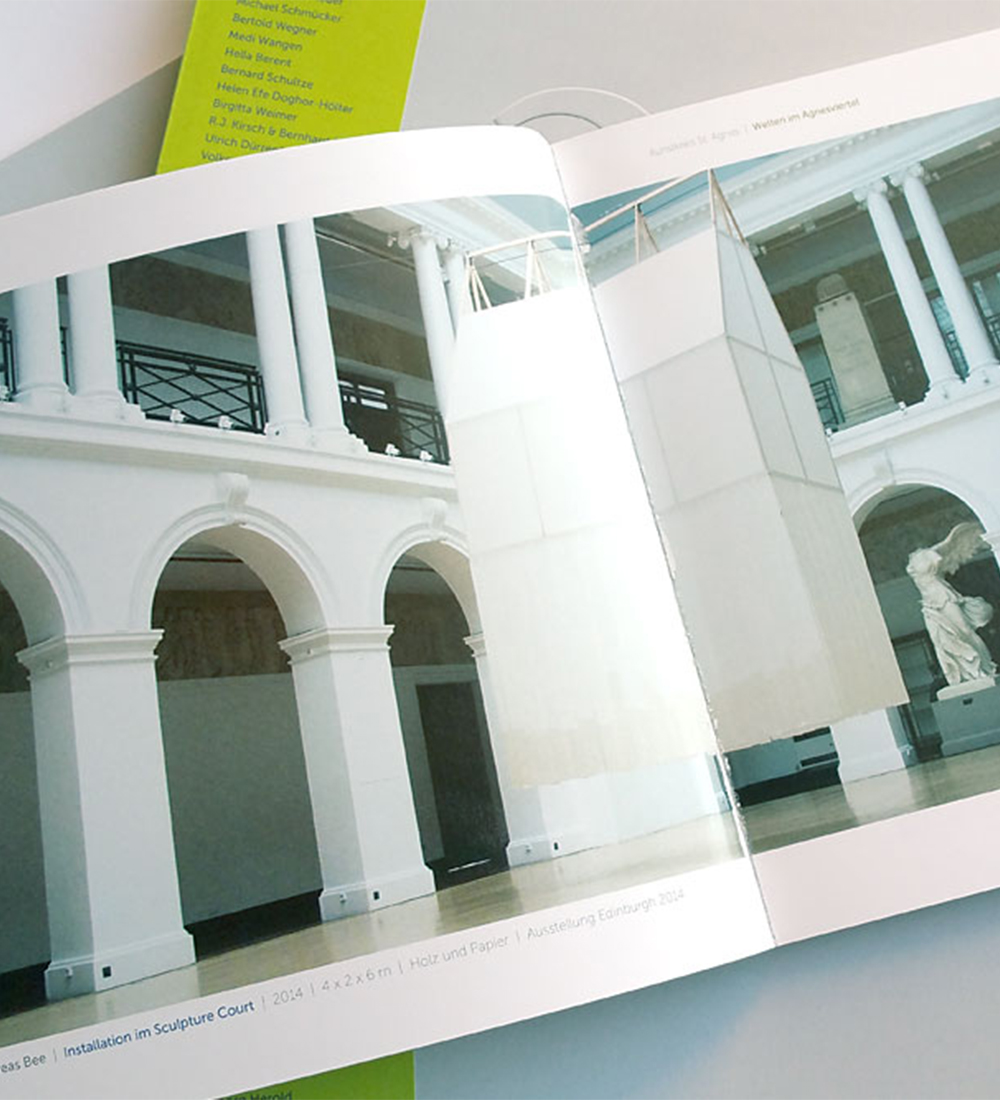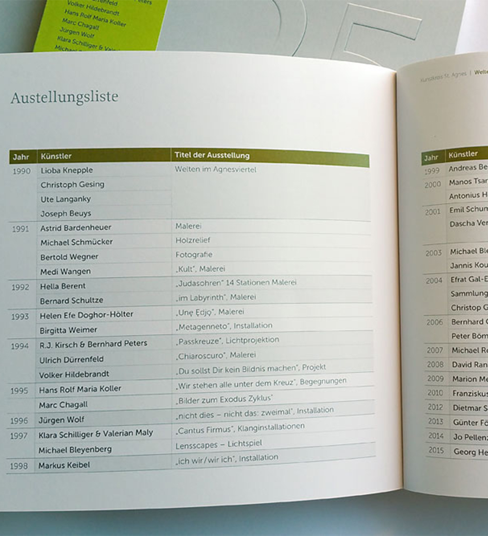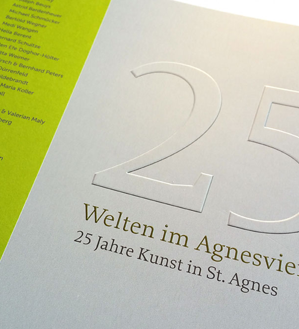 Konzept und Design. Katalog zum 25jährigen Jubiläum in St. Agnes. Im Katalog werden alle Künstler vorgestellt, die in diesem Zeitraum in St. Agnes ihre Ausstellungen präsentiert haben. Der Umschlag besteht aus einer Prägung und einem zusätzlichem, aufgeklebten Streifen, auf dem alle Künstler aufgelistet sind.