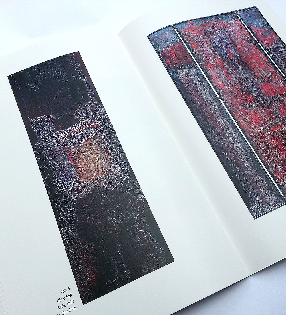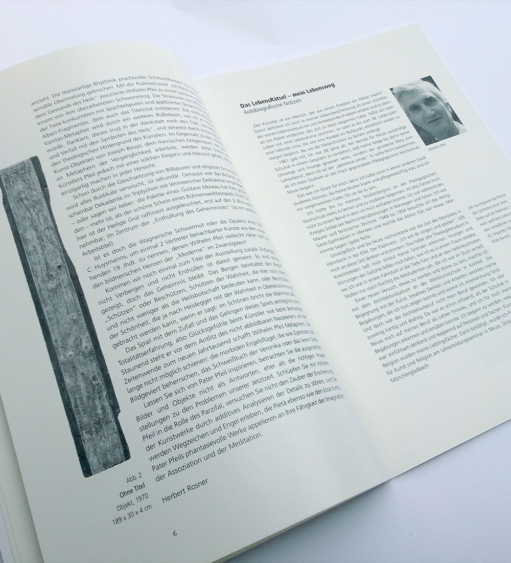 Der Katalog „Entbergen“ - benannt nach Spiritaner-Pater Wilhelm Pfeils künstlerischen Schaffens - symbolisiert den Kreuzgang in seinen Werken wieder, ausgestellt in der Bibliothek des Missionshauses Knechtsteden. Zu sehen sind Zeichenübungen aus der Studienzeit, architektonische Entwürfe und Batiken aus seiner frühen Schaffenszeit, vor allem aber seine Materialdrucke und Objekte aus Weggeworfenem und von ihm Gefundenem.